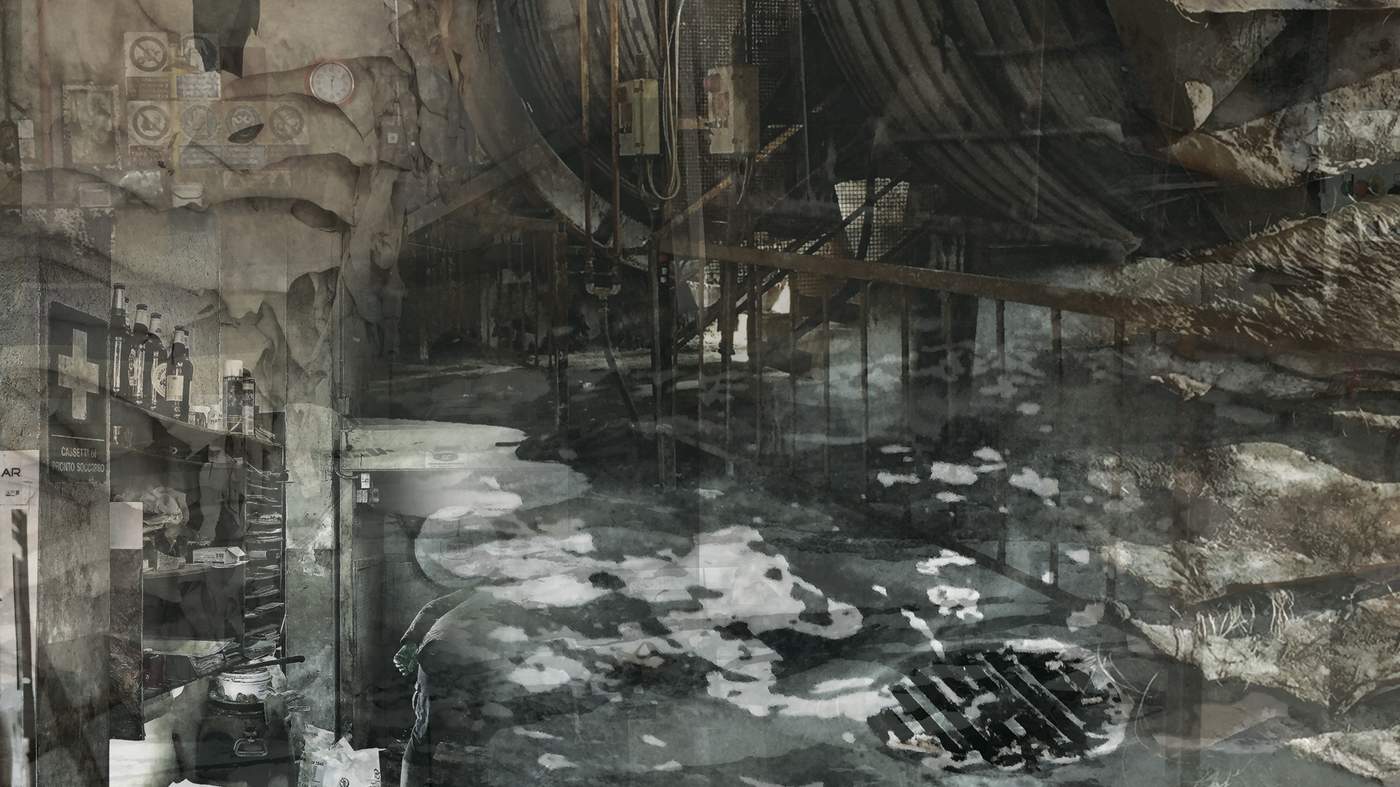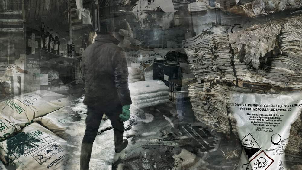 In der Gerberei stehen palettenweise Säcke und Fässer mit chemischen Substanzen, am Boden hat sich eine mit Schaumkronen bedeckte Lache gebildet.