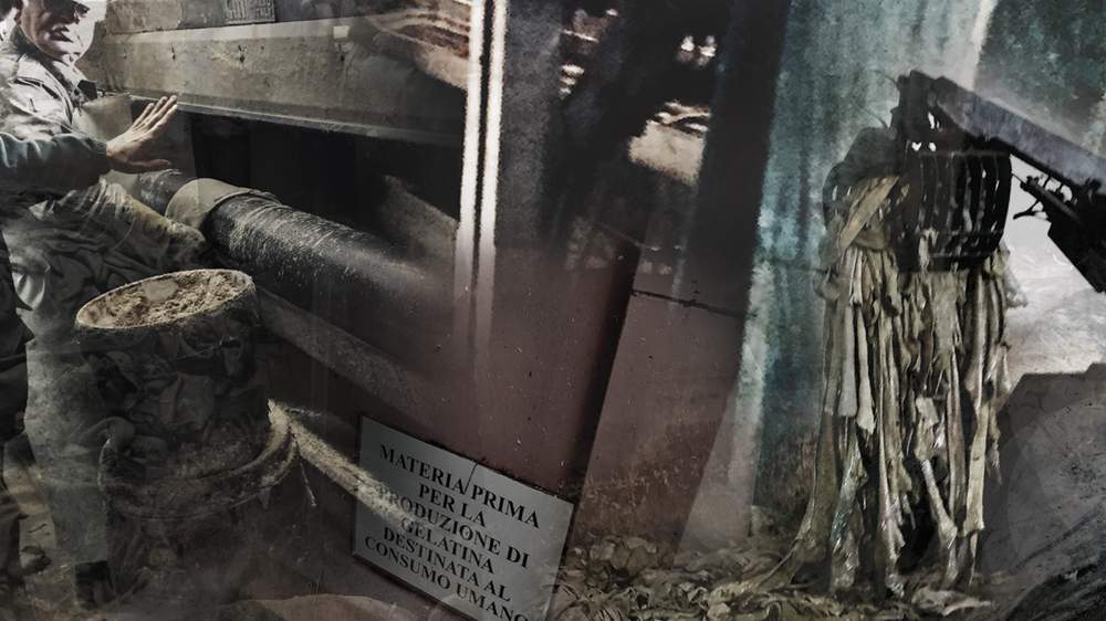 Die vier Männer tunken ihre Hände in einen Kessel voller Sägemehl, greifen hinter sich eine Haut, heben sie hoch und stecken sie in den Schlund der Maschine, welche die beim Schlachten verbliebenen Fleischstücke abraspelt. Auf einer weiteren Maschine wird die entfleischte Haut in einem zweiten Schritt gespalten: Die obere Schicht wird zu Leder, die untere zu Gelatine. Sie rutscht durch die Gemäuer in einen roten Container ausserhalb, auf dem geschrieben steht: «Materia Prima per la Produzione di Gelatina destinata al consumo umano.» Hunger macht das nicht. Im Gegenteil, von aussen sieht es aus, als würde sich das Gebäude in Zeitlupe erbrechen.