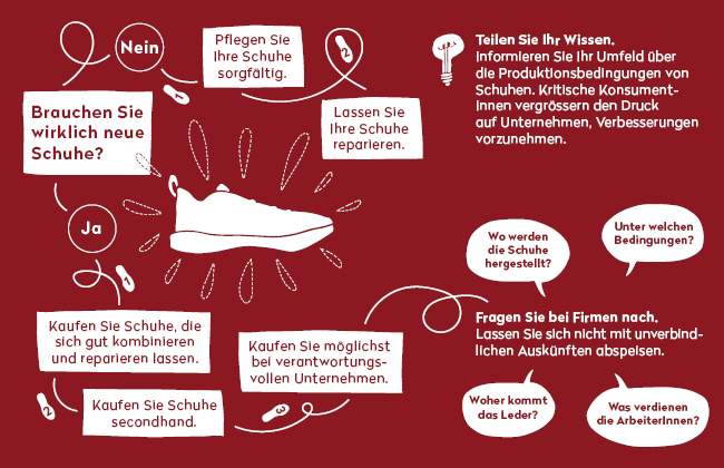 Wir können unsere Schuhe pflegen und reparieren, wir können sie aus zweiter Hand oder bei möglichst verantwortungsvollen Unternehmen erwerben. Wir haben es weitgehend selbst in der Hand, ob wir uns von Marken und Moden diktieren lassen, wie viele Schuhe wir kaufen. Doch alleine damit wird es nicht getan sein. Was wir als Konsumentinnen und Konsumenten, als politische Menschen mit Gerechtigkeitssinn wohl erst einmal tun sollten, ist das: